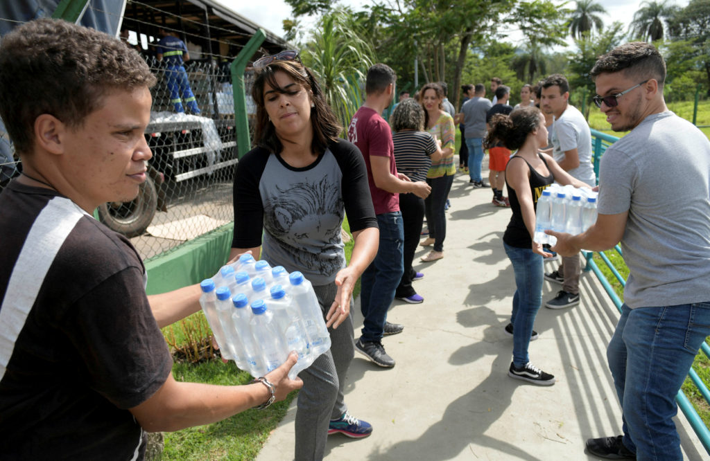 Volunteers pass bottles of water for people affected by a failed iron ore tailings dam owned by Brazilian miner Vale SA that burst, in Brumadinho, Brazil January 27, 2019. Photo By Washington Alves/Reuters